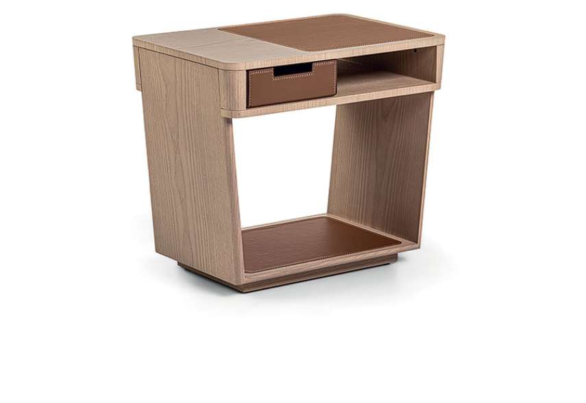 Прикроватный столик Ado в минималистичном стиле, выполнен из массива дерева и дополнен вставкой из кожи Cuoio с контрастной строчкой, зеркально отражающейся в основании, что придает ему особую элегантность. Открытое отделение позволяет добавить ящик, также обтянутый кожей. Благодаря своему лаконичному и современному виду, Ado изящно обставляет спальную зону.