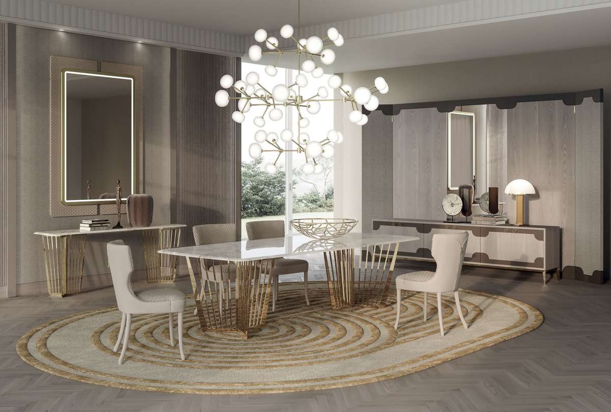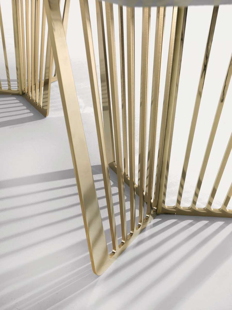 Лёгкость и прочность – оксюморон, воплощенный в консоли Alfieri. Уникальные металлические основания отличаются вертикальным дизайном, чередующим полные и пустые секции. Мраморная столешница украшена металлической инкрустацией, повторяющей линии оснований, что создаёт визуальную и цветовую непрерывность. В одноимённую коллекцию также входят небольшие столики и консоли, что делает её комплексным решением.