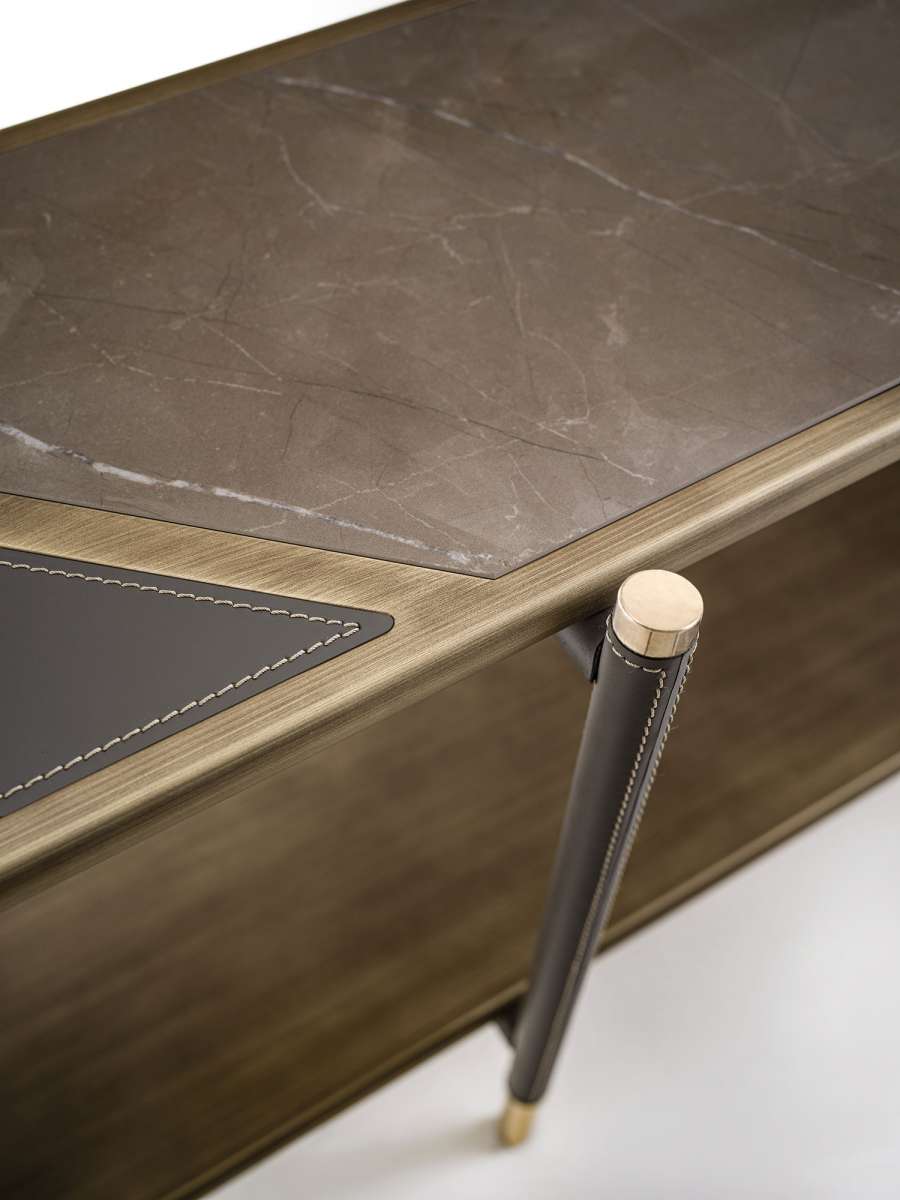 Коллекция Araldo отличается богатством материалов, фактур и гибкостью. В частности, консоль Araldo с воздушной структурой и кожаной обивкой с золотистыми деталями подчёркивает красоту материалов: верхняя столешница украшена бордюром из патинированного бронзового дерева со вставками из керамогранита с мраморным эффектом и кожи, гармонирующими с конструкцией. Нижняя полка выполнена из патинированного бронзового дерева. Araldo — это предмет мебели, в котором чёткая форма является манифестом.