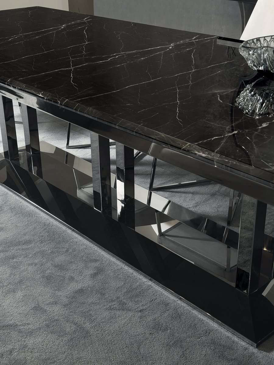 Коллекция столов, столиков и консолей, характеризующаяся важным каркасом из шлифованной стали с лазерной обработкой, на котором расположена верхняя столешница из мрамора, стекла или зеркала. Стол отличается намеренно прочным дизайном и яркой индивидуальностью. Он может придать стильный и элегантный характер любому помещению, гармонично сочетаясь со всеми стульями коллекции Longhi.