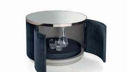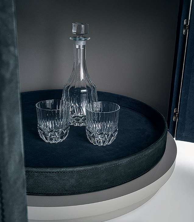 Круглый столик Atar для использования в качестве бара с каркасом, обтянутым кожей. Створки с механизмом push-pull. Внутри предусматривается поворотный поднос для бутылок, обтянутый кожей.