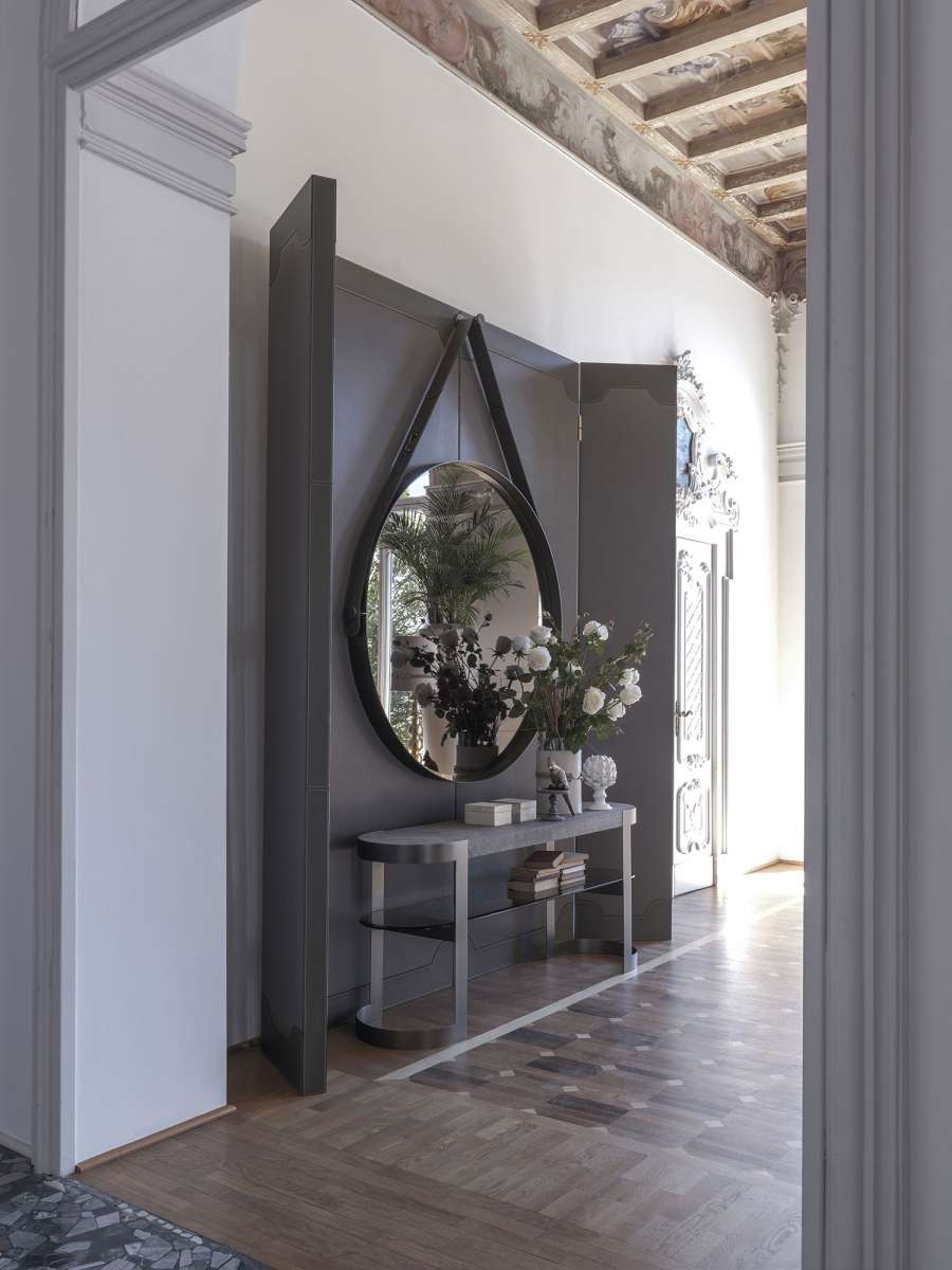 Консоль Biffi сочетает в себе плавные изгибы и строгие линии, представляя собой универсальное и роскошное изделие. Металлические ножки словно элегантные крылья обхватывают столешницу. Столешница консоли, выполненная из мрамора или керамогранита, придаёт изысканному предмету роскоши. Центральная полка из бронзированного стекла делает ансамбль более лёгким, а её идеальные пропорции повторяют форму столешницы. Biffi также доступна в версии Beauty Desk с креслом в комплекте. Эта серия мебели наилучшим образом воплощает концепцию формального совершенства.