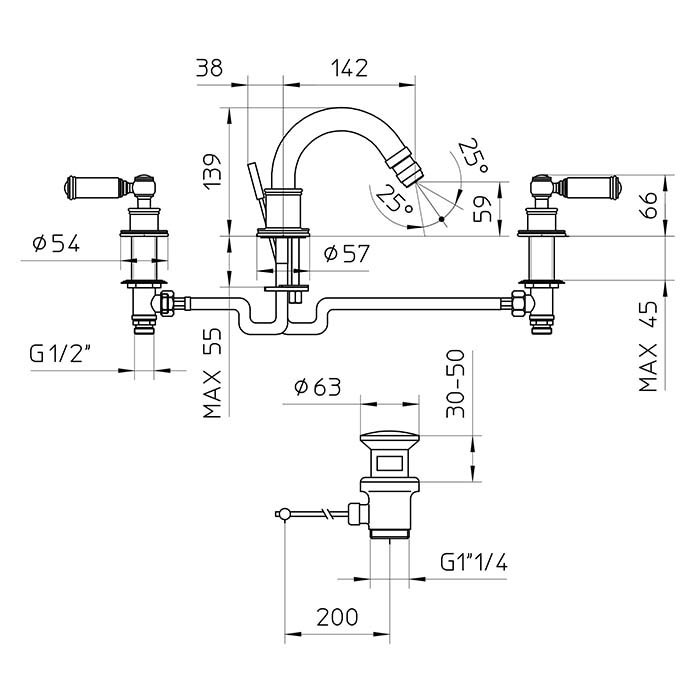 Bossini Liberty Смеситель для биде на 3 отверстия с поворотным изливом и заглушкой 1”1/4, цвет: никель матовый
