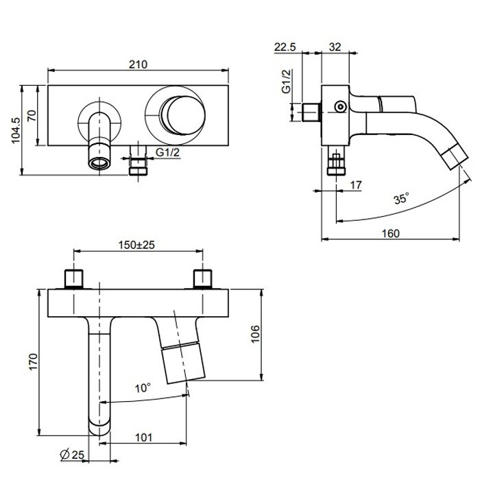 Ceadesign DUET Насте...Ceadesign DUET Настенный набор из 2 смесителей для ванны с изливом L. 170 мм и круглым ручным душем Ø 65 мм, 4 отверстия, цвет на выбор