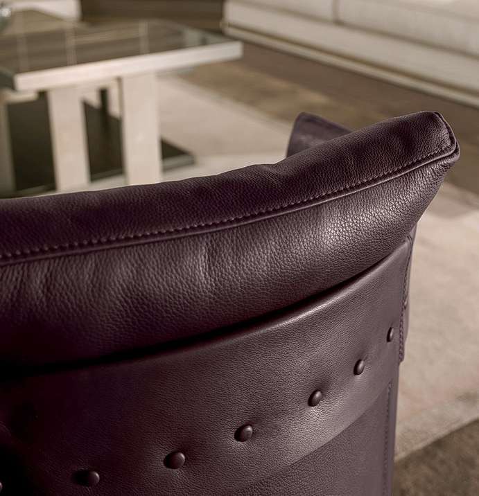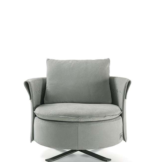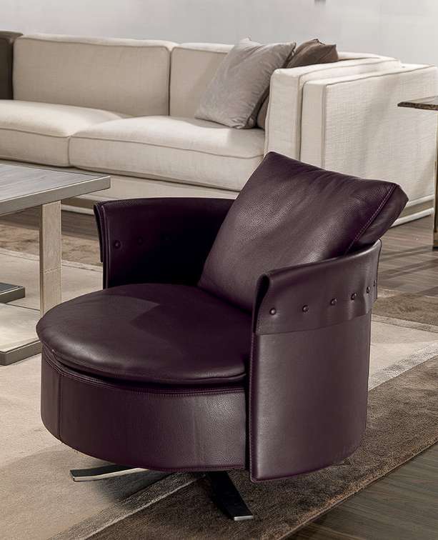 Важное кресло с вращающимся основанием - обязательный предмет для коллекции Loveluxe. Charme - это богатое изделие, сохраняющее строгую и простую линию, которая вверяет ценности материала большую часть экспрессивности проекта. Спинка представляет собой элегантный обволакивающий каркас, обтянутый кожей и продолжающийся в подлокотниках, которые, слегка рас- ширяясь по краям, создают небольшую складку, закрытую пуговицами, как легкое оригами. После успеха этого кресла рождаются также диван и кровать Charme.