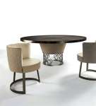 Коллекция обеденных столов Clairmont отличается удивительным сочетанием материалов и отделок в уникальном и изысканном вкусе. Каркас состоит из рамы и расположенной под столешницей панели с кожаной обивкой и из опирающегося на пол основания из шлифованного металла с декором «Sequence». Столешница изготавливается из мрамора,стекла или дерева и может иметь овальную или круглую форму. Круглая версия может оснащаться поворотным подносом, придающим столу практичность и эффективность.