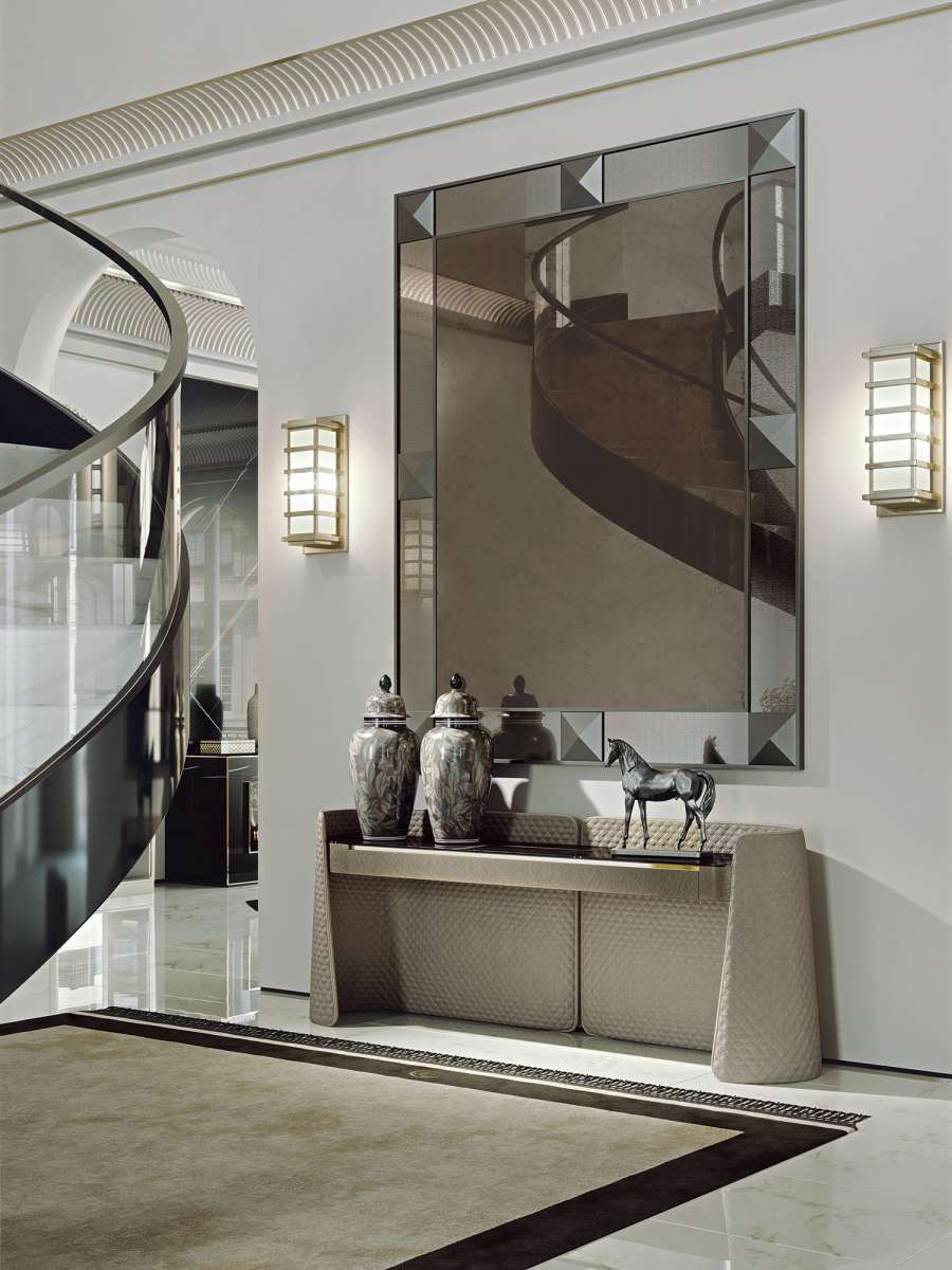 Семейство Contarini, с его роскошным и культовым дизайном, также включает консоль, доступную в двух роскошных версиях: Contarini может быть выполнена либо с каркасом, украшенным изысканной стёжкой, либо, по запросу, с изящной тиснёной вышивкой. Верхняя часть консоли состоит из мраморной столешницы и деревянного ящика, оба варианта отделки доступны на выбор среди роскошных вариантов коллекции. Каркас дополнен застёжкой-молнией, которая обрамляет текстильные элементы. Консоль Contarini, настоящий шедевр ручной работы, с лёгкостью украсит любую комнату, как для дня, так и для ночи. Возможность выбора среди множества вариантов отделки делает изделие невероятно гибким и персонализированным.