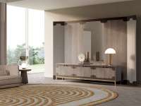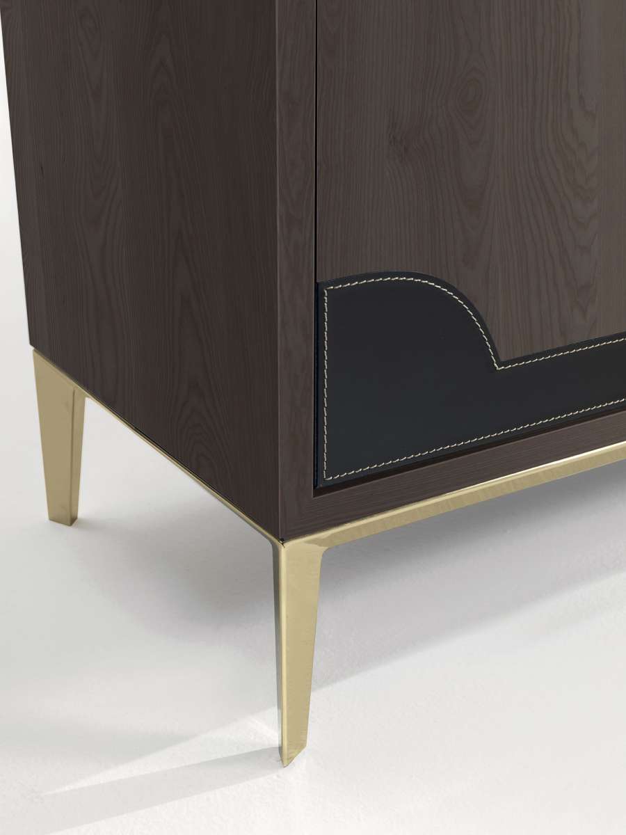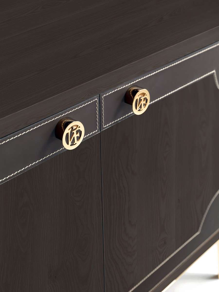 Сервант Crivelli отличается деревянной конструкцией с изысканными кожаными вставками на дверцах, подчеркивающими его профиль, и металлическим основанием в цветах коллекции VF, которое визуально приподнимает конструкцию. Металлические ручки с логотипом VF украшают дверцы серванта. Изысканные детали корпуса контрастируют со строгими линиями, создавая строгий и элегантный образ, который придаст любому помещению изысканный и изысканный вид.