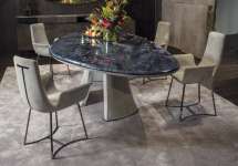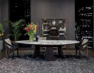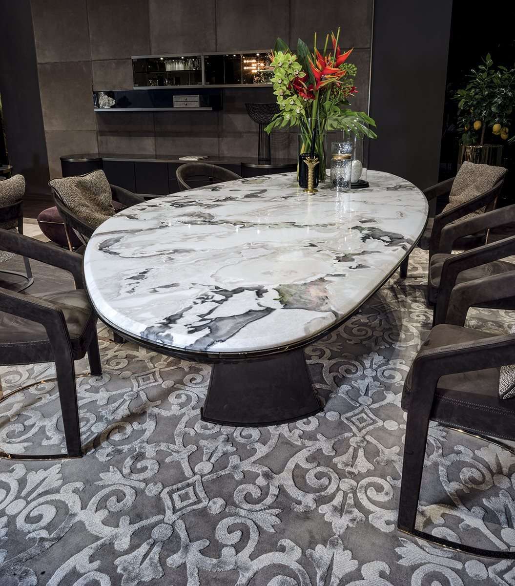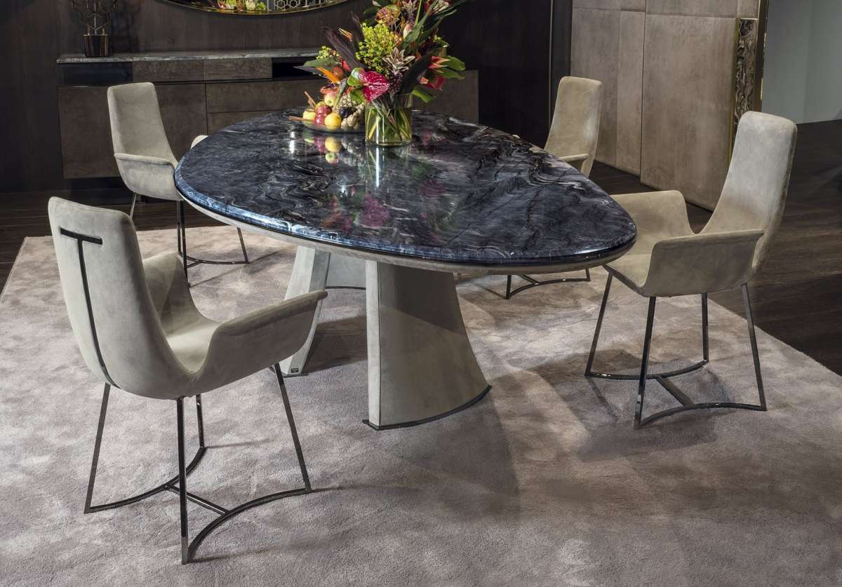 Стол Damien отличают элегантность и извилистость форм. Грациозные обтянутые кожей ножки из пеноматериала высокой структурной плотности, полученные в эксклюзивной пресс-форме, придают столу обтекаемую форму. Периметральный профиль мраморной столешницы выполнен с металлической кромкой.