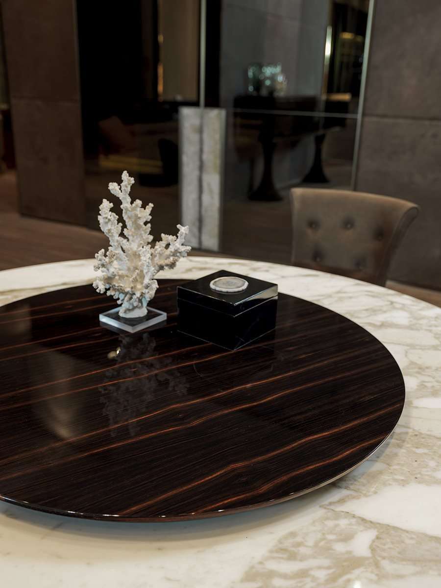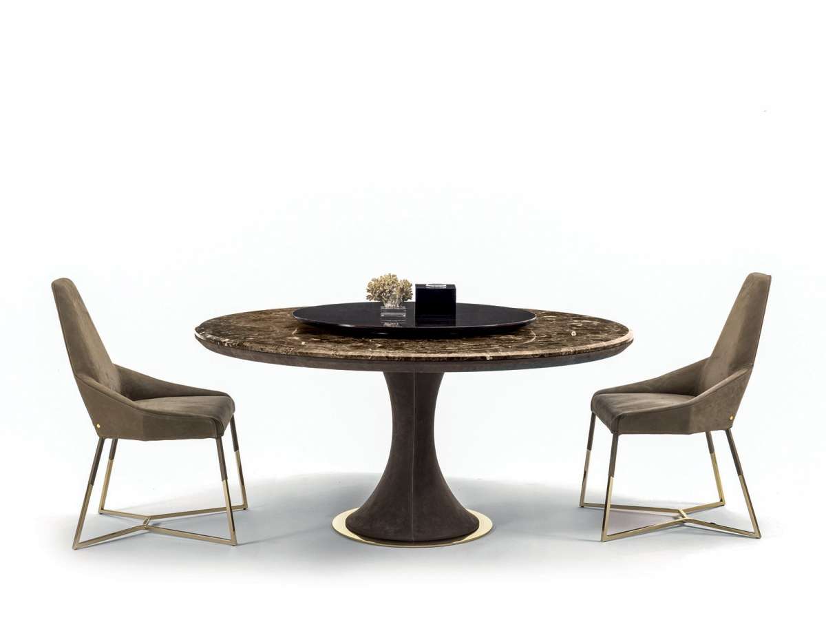 Круглый стол David с гиперболоидным основанием из стеклопластика с кожаной обивкой, обладающим изящной чашеобразной линией, и с очень гармоничной опорой. Расположенный в центре поворотный поднос придает функциональность мраморной или деревянной столешнице. Чистота дизайна и изысканность конструктивных деталей дополняются ценными отделками. Стол был задуман, спроектирован и реализован для использования в любом помещении.