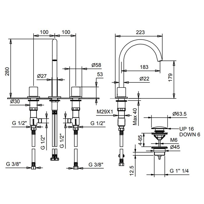 Fantini Lame Смеситель для раковины, 3 отв., с нажимн. донным клапаном, излив 183мм, цвет: хром