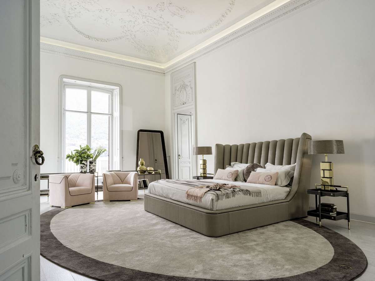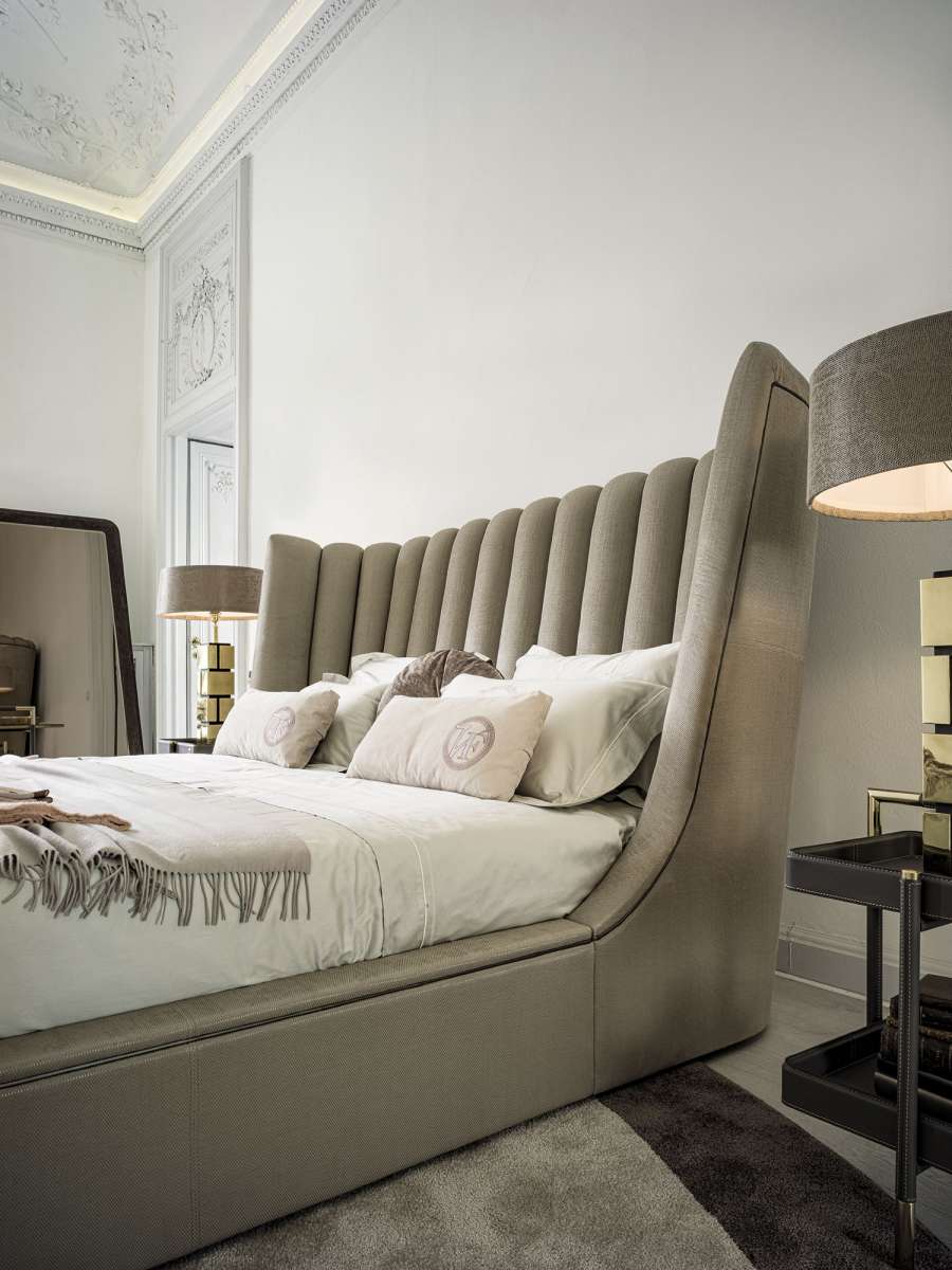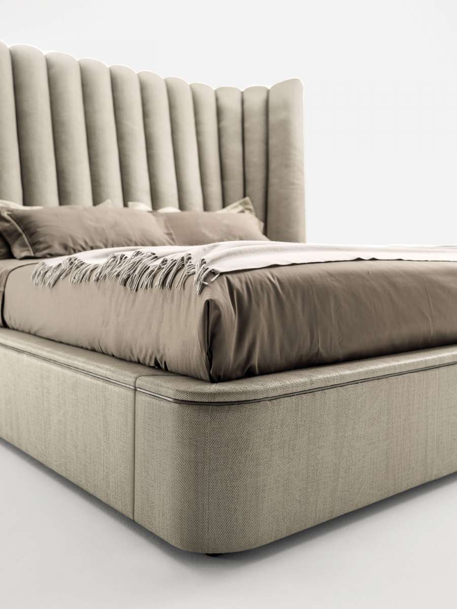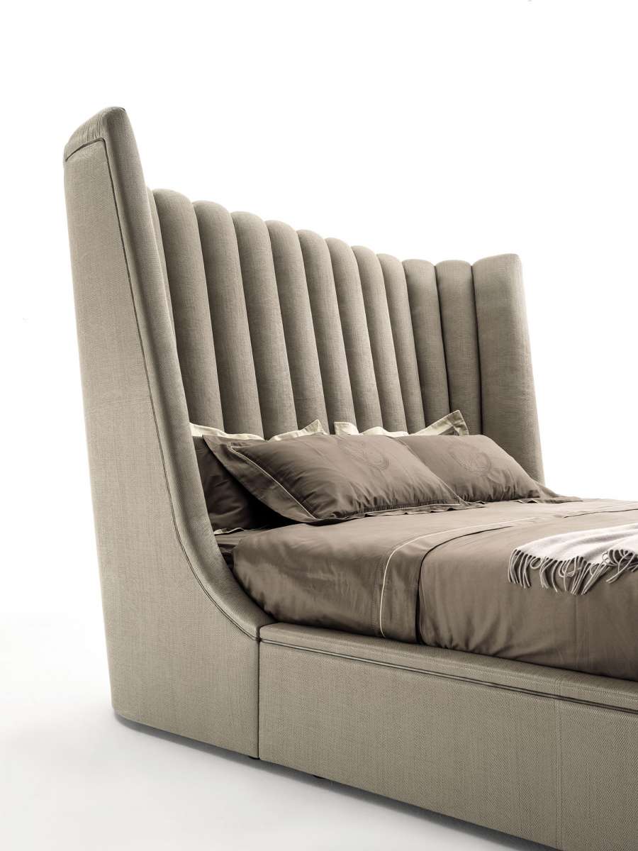 Изголовье кровати Farnese, словно парус, разворачивающийся на горизонте, раскрывается веером, подчеркивая мягкие полосы, отделанные кантом. Кровать Farnese отличается лаконичным каркасом, который ещё больше подчёркивает красоту изголовья, чья отделка становится отличительной чертой коллекции.