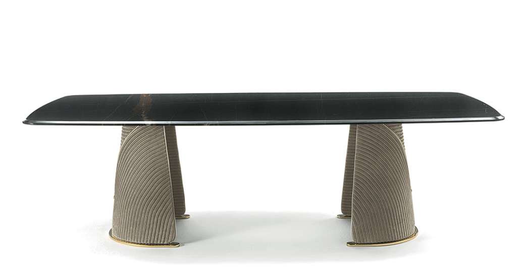 Стол Foscari визуально лёгкий, но он, безусловно, не останется незамеченным благодаря деталям ручной работы, которые его характеризуют. Столешница, в своей предельной простоте, подчёркивает драгоценную мраморную отделку, а основания, доступные в двух вариантах, предлагают оригинальные варианты отделки. Основание Foscari версии A выделяется двумя полукруглыми ножками, обтянутыми тканью или кожей, с вышивкой и молнией в качестве дополнительного декоративного элемента. Версия B отличается тканевой или кожаной обивкой с стеганым покрывалом и контрастным вышитым логотипом VF, что создаёт ещё более роскошный эффект. В обоих вариантах основания установлены на металлической пластине в цветах коллекции VF.