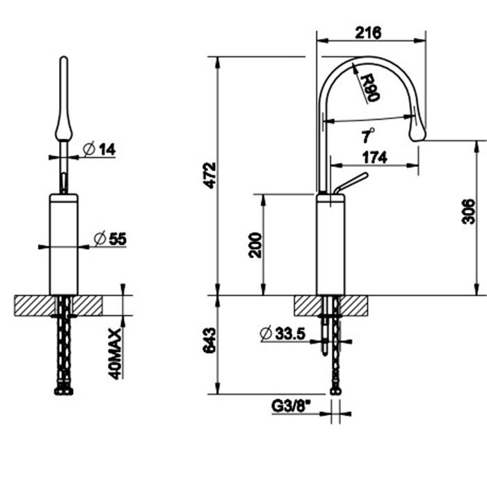 Gessi Goccia Смеситель для раковины на 1 отверстие, высокий, излив 174мм R=90, с фиксированным носиком, цвет: хром