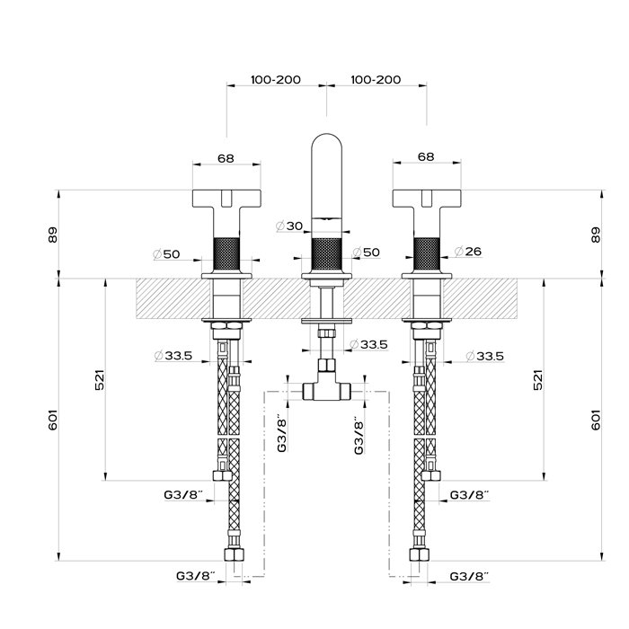 GESSI INCISO Смеситель для раковины на 3 отверстия без донного клапана, излив 140мм, h=145мм, цвет: Finox Brushed Nickel