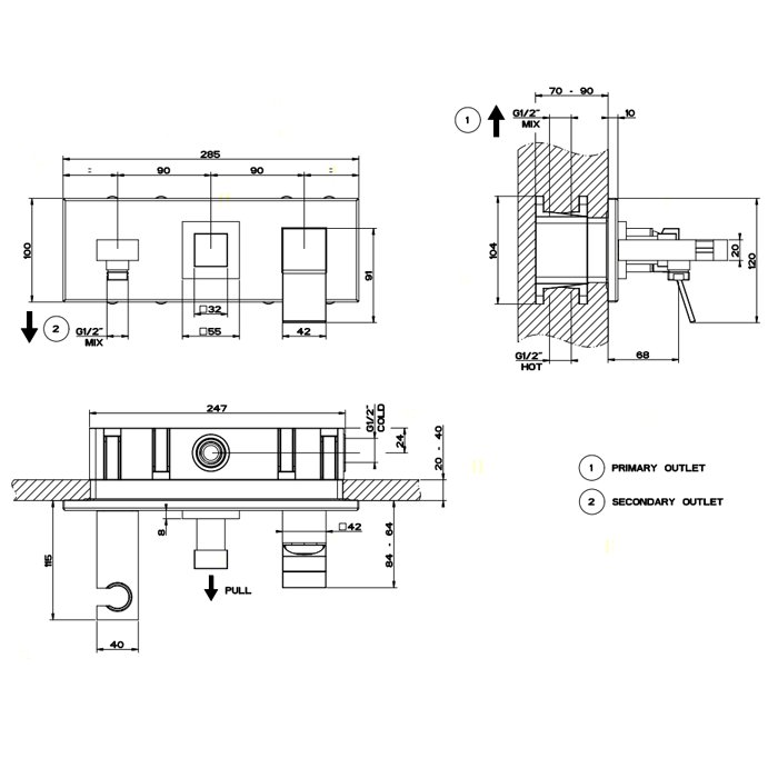 Gessi Rettangolo K Встраиваемый смеситель с изливом, подводом воды, держателем лейки и переключателем PULL(внешние части), цвет: хром