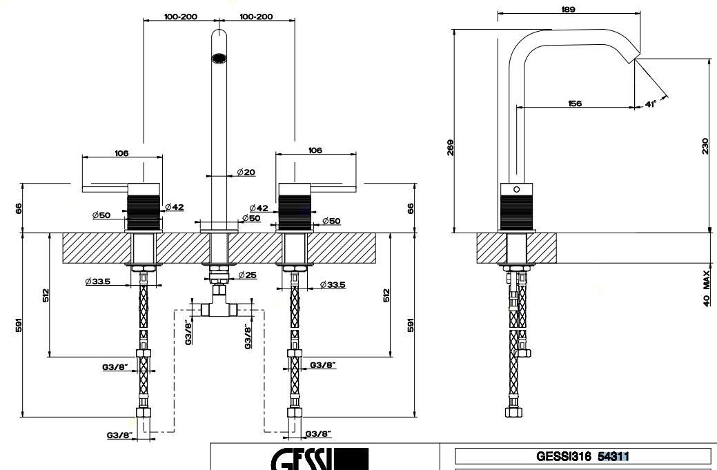Trame GESSI 316 Смеситель для раковины на 3 отверстия, без донного клапана, излив 156мм, h=269мм, цвет: steel brushed