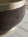 Столики из стеклопластика с цилиндрическим корпусом, полностью обтянутым кожей или тканью, и крышкой с металлической отделкой. Так родилась серия сервировочных элементов, состоящая из трех вариантов:столики с подносом или без него и с подставкой, используемой в качестве опорной поверхности в самых разнообразных ситуациях, кашпо и барные элементы со съемным ведерком из стали для бутылок и бокалов.