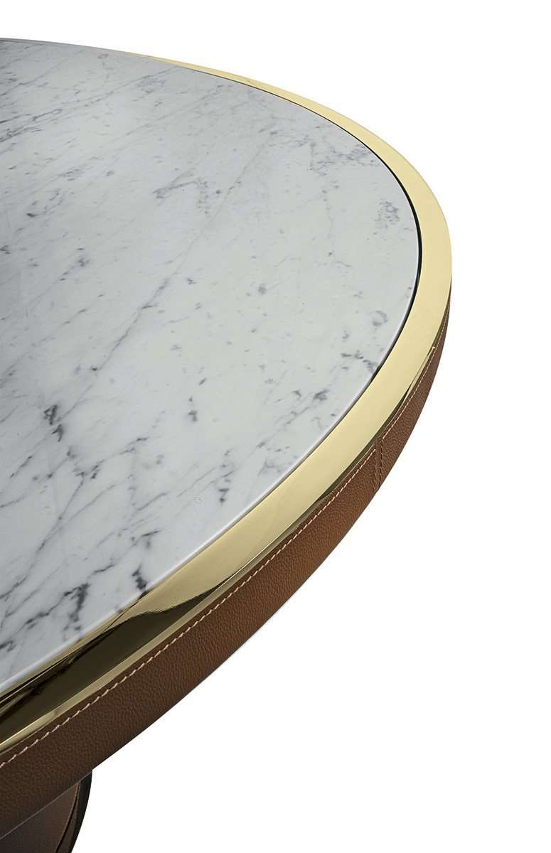 Стол Journey отличают элегантность и извилистость форм. Представленный в современном ключе и украшенный такими благородными выразительными материалами, как металл, мрамор и кожа, он непринужденно вписывается в изысканную современную обстановку. Встроенная мраморная столешница выполнена с металлической окантовкой, повторяющей деталь ножки.