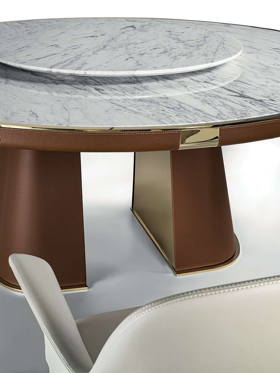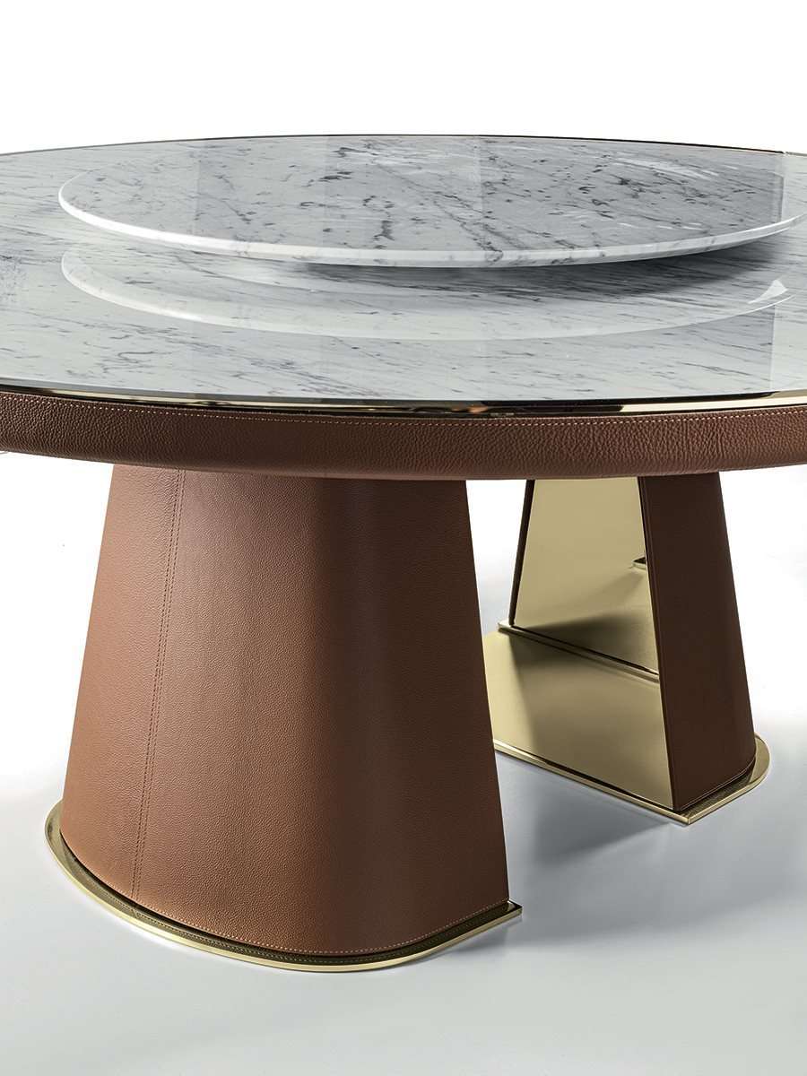 Стол Journey отличают элегантность и извилистость форм. Представленный в современном ключе и украшенный такими благородными выразительными материалами, как металл, мрамор и кожа, он непринужденно вписывается в изысканную современную обстановку. Встроенная мраморная столешница выполнена с металлической окантовкой, повторяющей деталь ножки.