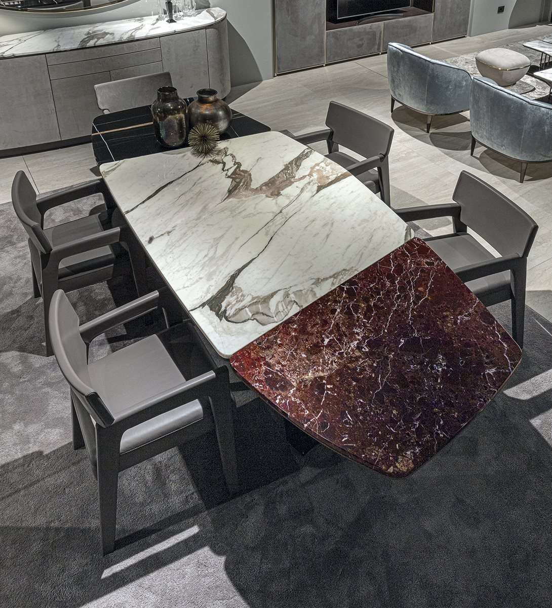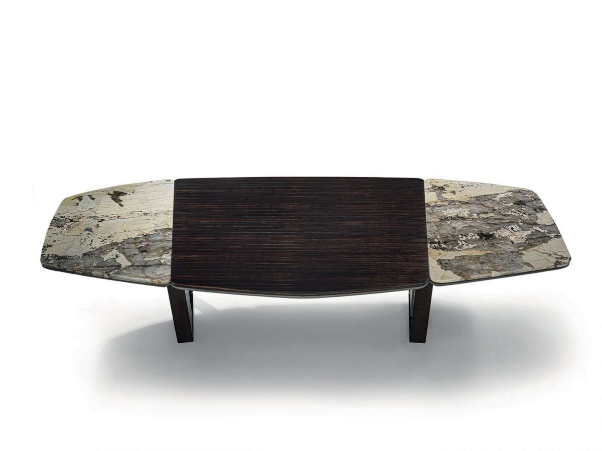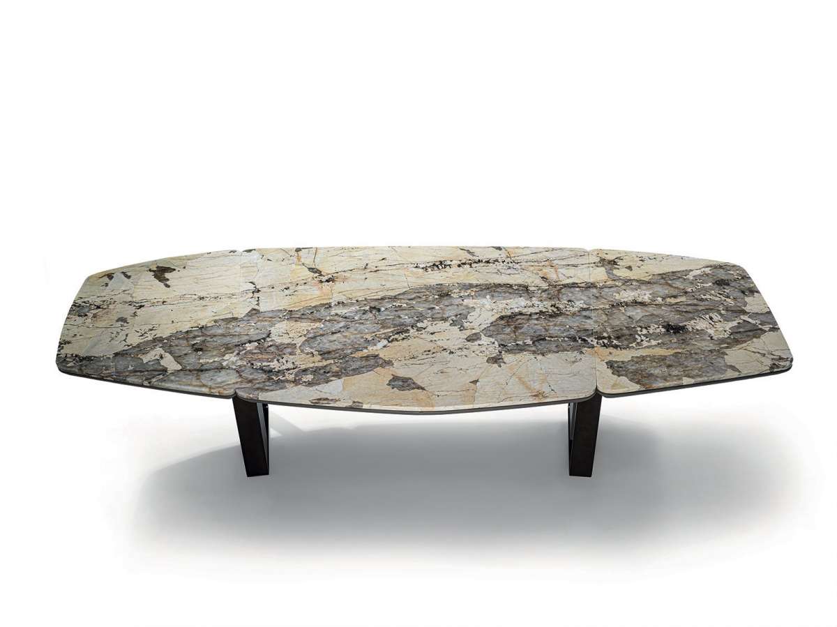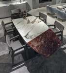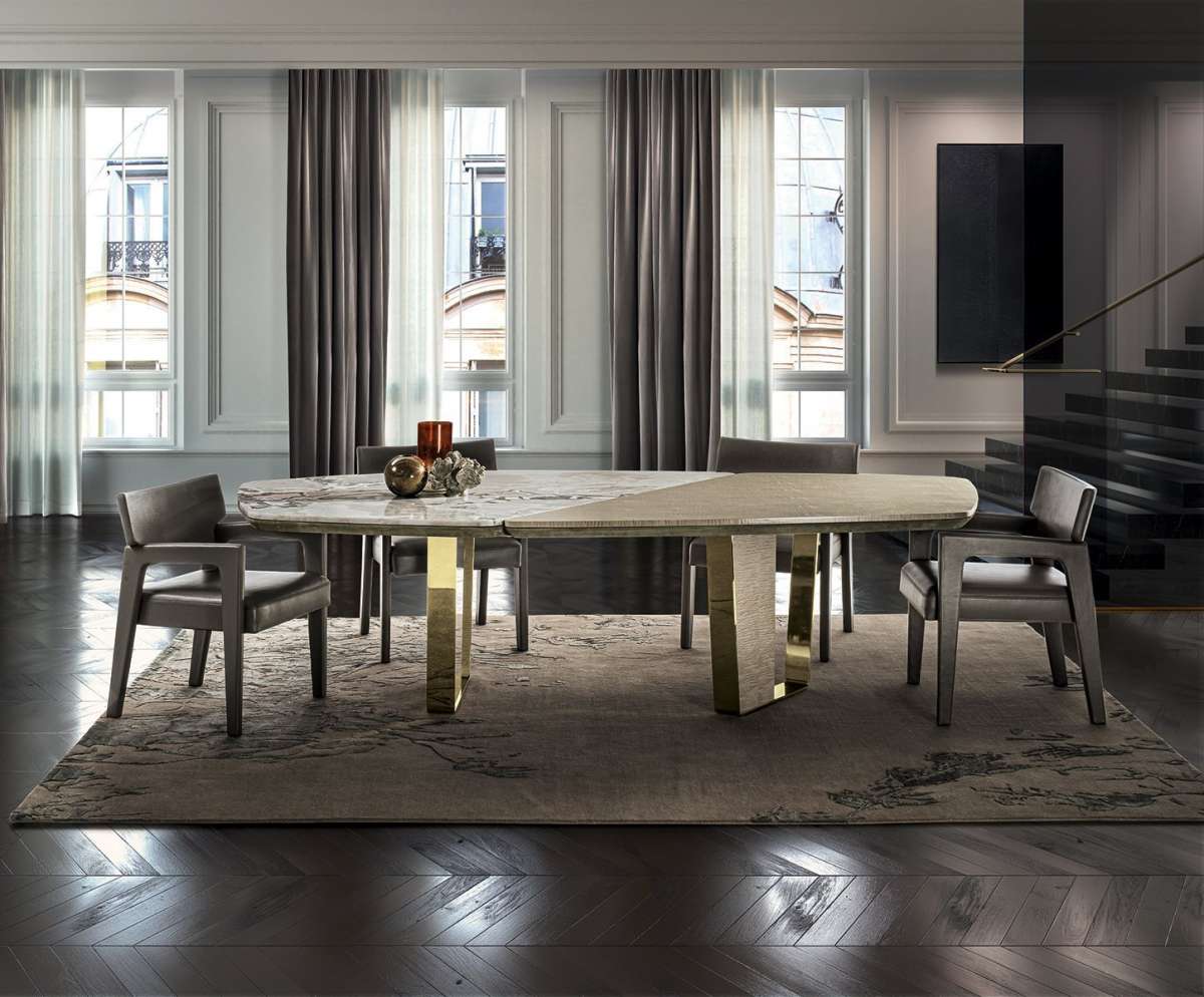 Keope - стол с профильной столешницей с секциями из разных материалов и 2 трапециевидными ножками со вставкой из кожи или дерева. Солидный и эффектный, он выпускается со столешницей, разделенной на 2 или 3 части. Коллекция Keope, включающая стол, консоль и тумбу, выражает непреходящую элегантность, вдохновленную динамизмом подлинного современного шика, в котором изысканные материалы, ценные разновидности мрамора и чистые формы пробуждают ощущения, полностью заключающие в себе проектный подход этого бренда.