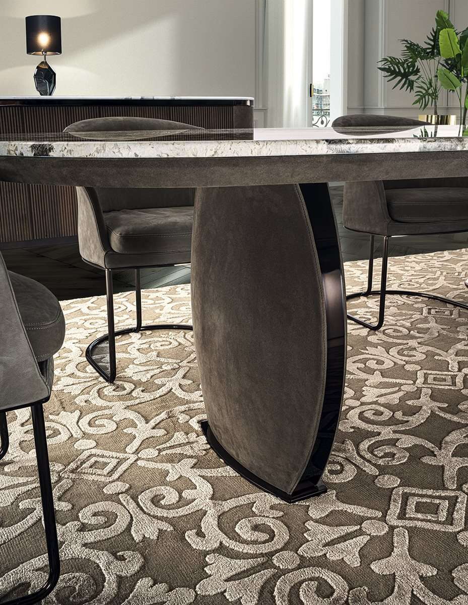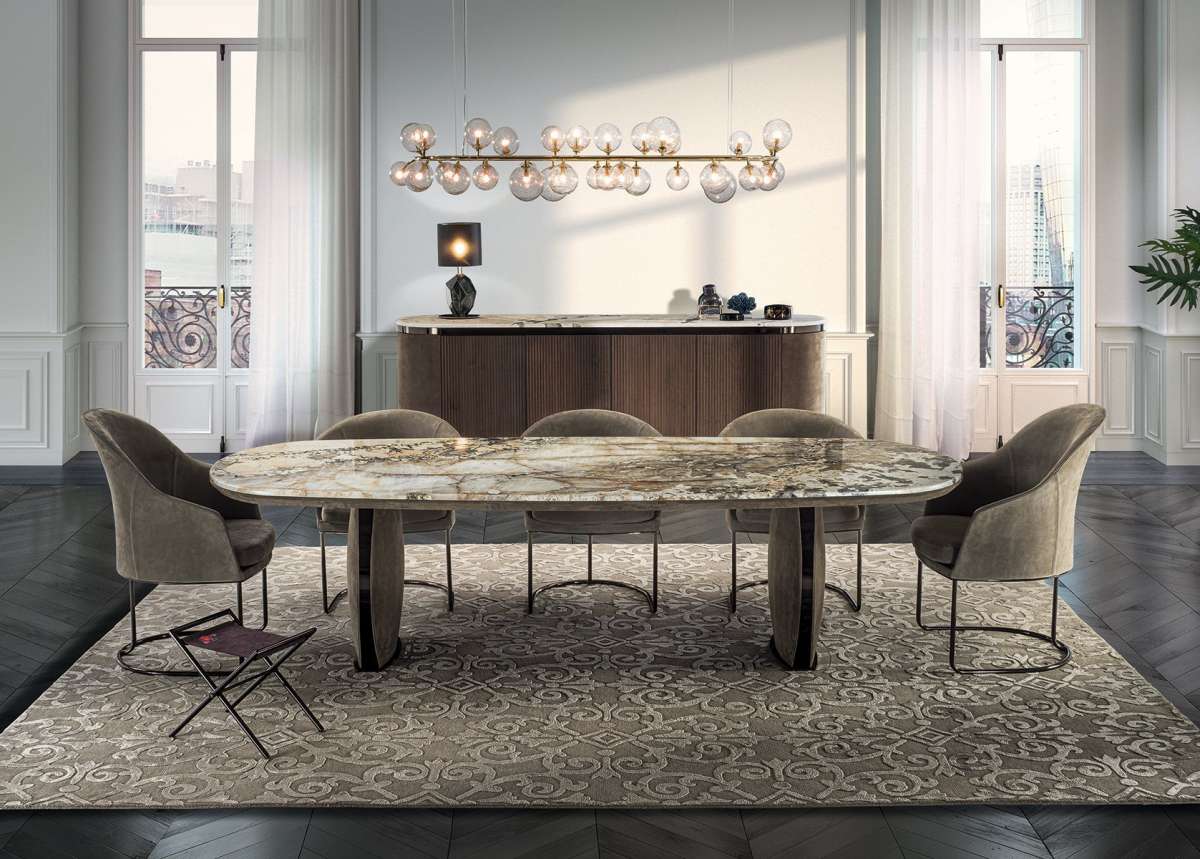 Стол Lotus богато украшен ценными деталями: ножка в виде лепестка, тонкий металлический профиль, столешница с закругленным краем и возможность вставки эксклюзивной вышивки на атласе «Marlène».