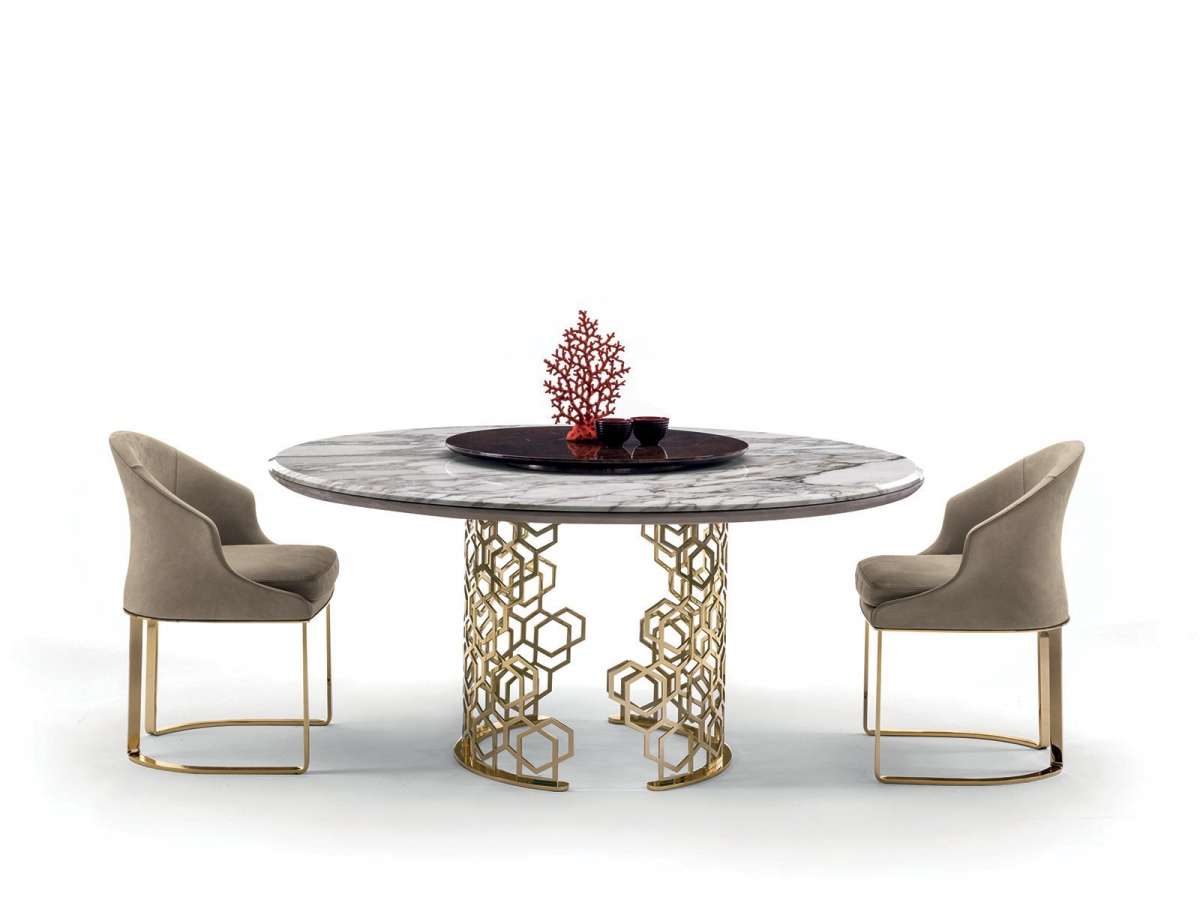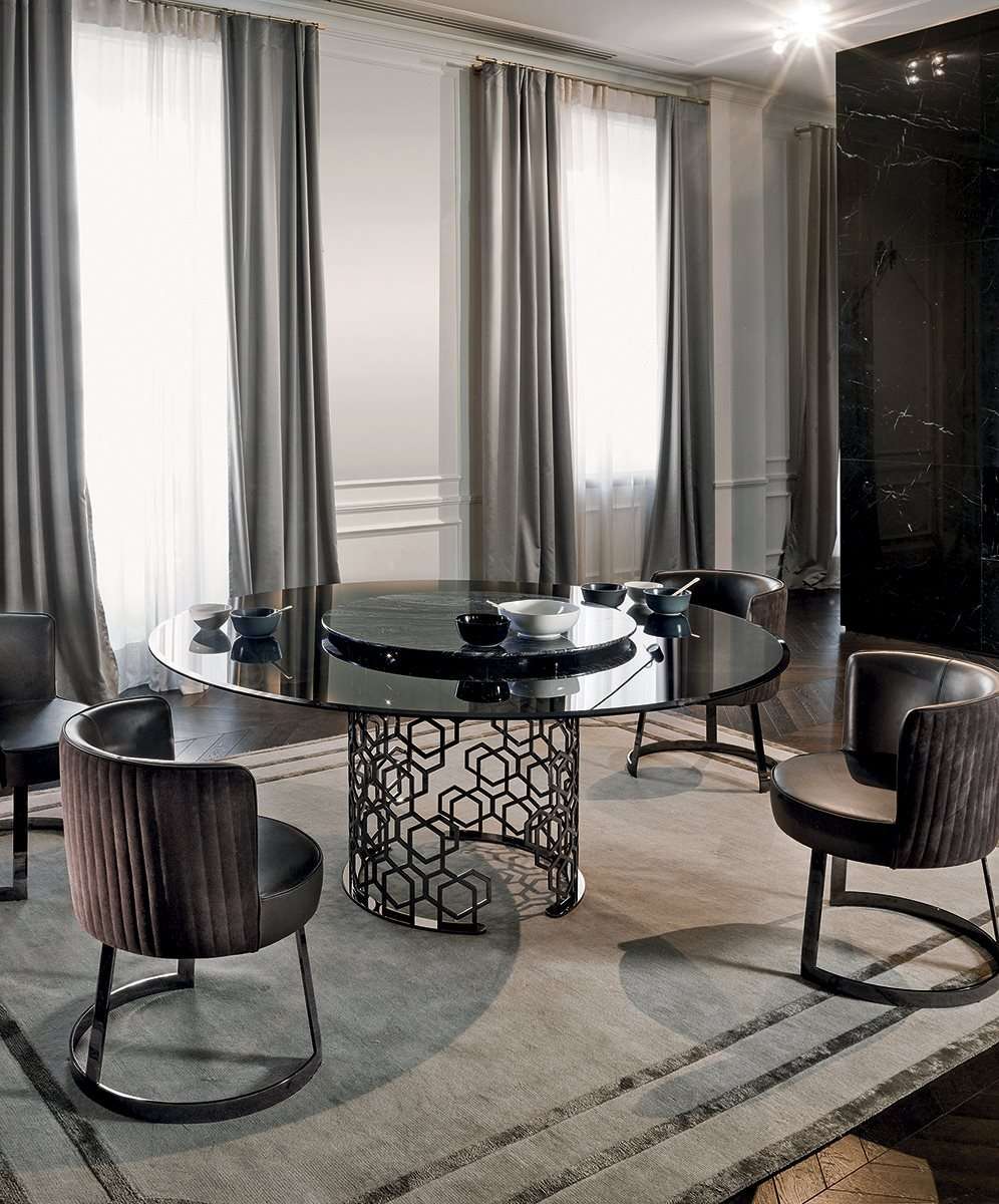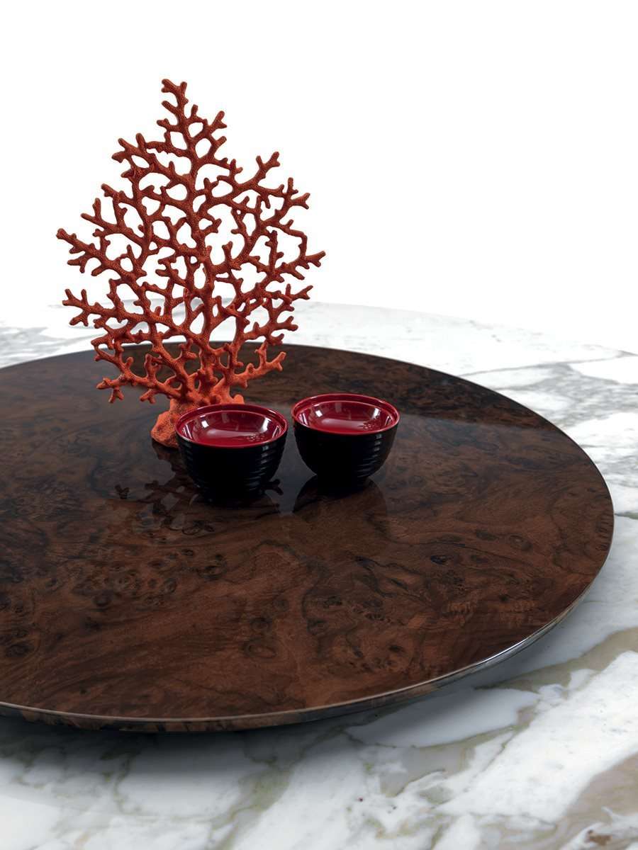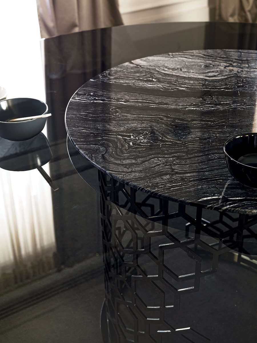 Серия столов и столиков Manfred, обладающих неповторимой индивидуальностью благодаря основанию «Sequence». Его ажурный узор кажется творением ручной работы, хотя на самом деле является результатом утонченной лазерной обработки. Декор «соты» от Джузеппе Яспарры - это стиль, подлинный знаковый рисунок, который используется в различных изделиях коллекции Loveluxe - столах, шкафах, а также буазери - и представляет собой уникальный выразительный язык Longhi. Расположенный в центре поворотный поднос придает функциональность мраморной или деревянной столешнице.