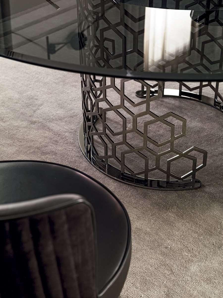 Серия столов и столиков Manfred, обладающих неповторимой индивидуальностью благодаря основанию «Sequence». Его ажурный узор кажется творением ручной работы, хотя на самом деле является результатом утонченной лазерной обработки. Декор «соты» от Джузеппе Яспарры - это стиль, подлинный знаковый рисунок, который используется в различных изделиях коллекции Loveluxe - столах, шкафах, а также буазери - и представляет собой уникальный выразительный язык Longhi. Расположенный в центре поворотный поднос придает функциональность мраморной или деревянной столешнице.