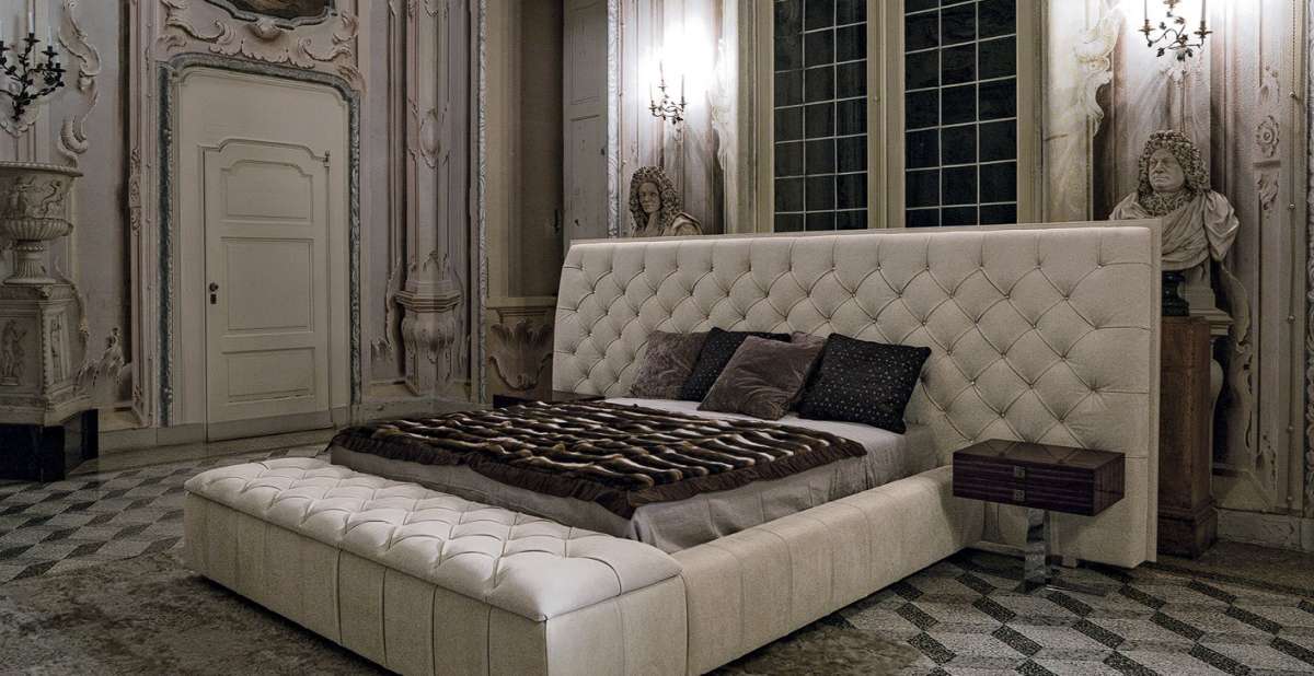 Внушительная кровать Napoleon отличается изголовьем двойной высоты с простежкой капитоне и пуговицами с кристаллами Swarovski. Узор усиливает декоративный характер кровати и делает ее по-настоящему универсальным предметом в помещениях современно-классического стиля. Кровать предлагается в комплекте со скамьей-контейнером, устанавливаемой в изножье, или без нее.