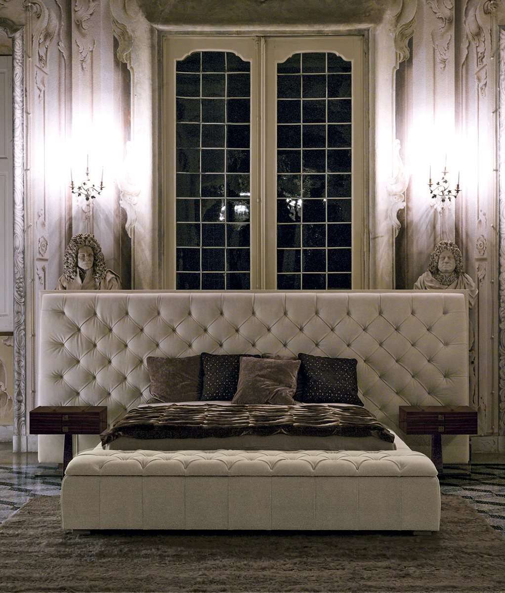 Внушительная кровать Napoleon отличается изголовьем двойной высоты с простежкой капитоне и пуговицами с кристаллами Swarovski. Узор усиливает декоративный характер кровати и делает ее по-настоящему универсальным предметом в помещениях современно-классического стиля. Кровать предлагается в комплекте со скамьей-контейнером, устанавливаемой в изножье, или без нее.