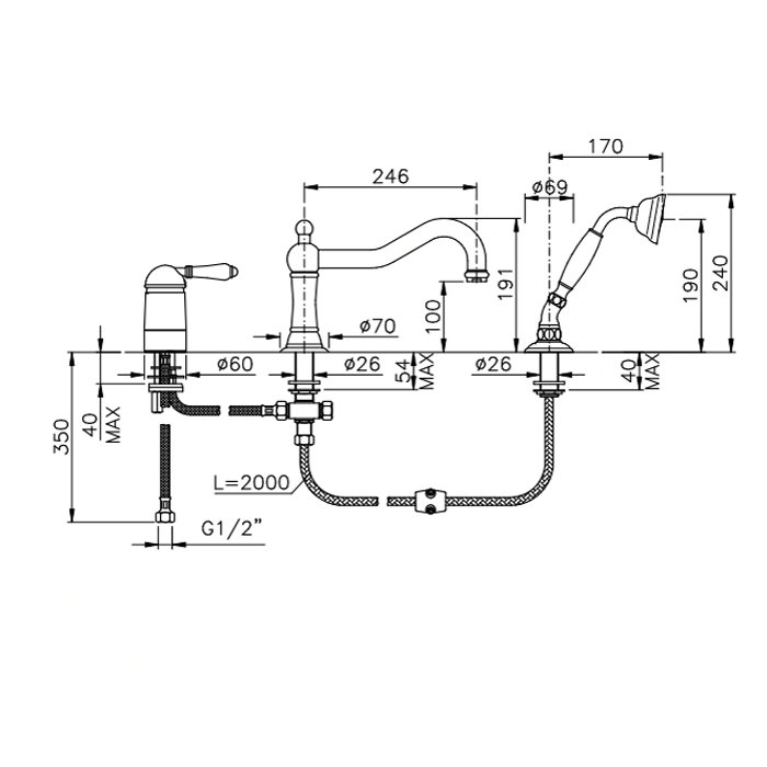 Nicolazzi Forest Смеситель на борт ванны на 3 отверстия, с изливом 246мм и ручным душем, ручки дерево, цвет: хром
