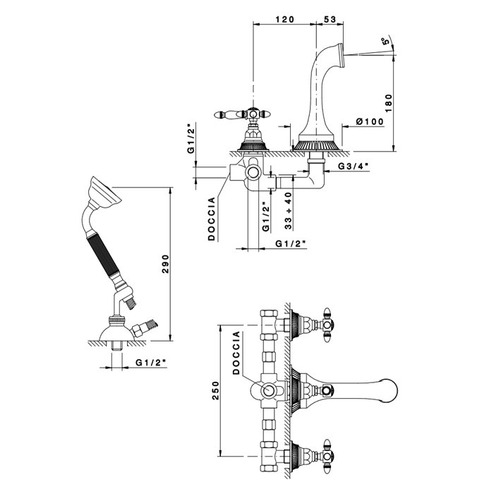 Nicolazzi Impero Смеситель для ванны с изливом из стены на 4 отверстия, встраиваемый, излив: 180 мм, цвет: хром