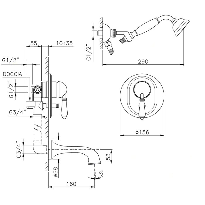 Ceadesign DUET Насте...Ceadesign DUET Настенный набор из 2 смесителей для ванны с изливом L. 170 мм и круглым ручным душем Ø 65 мм, 4 отверстия, цвет на выбор