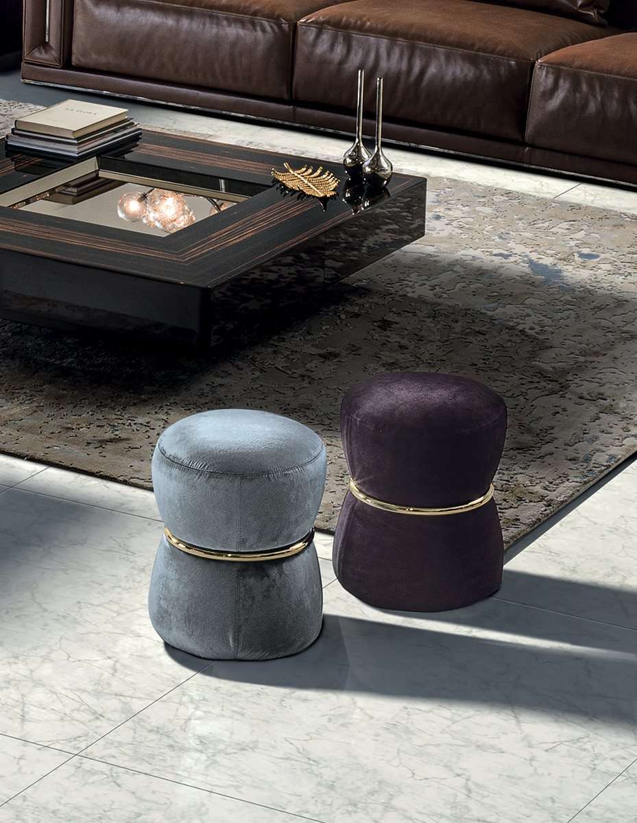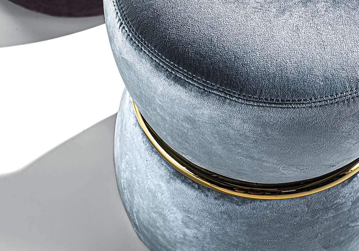 Пуф RIVER своеобразной формы в виде песочных часов с особой кольцевой вставкой из хромированного металла.