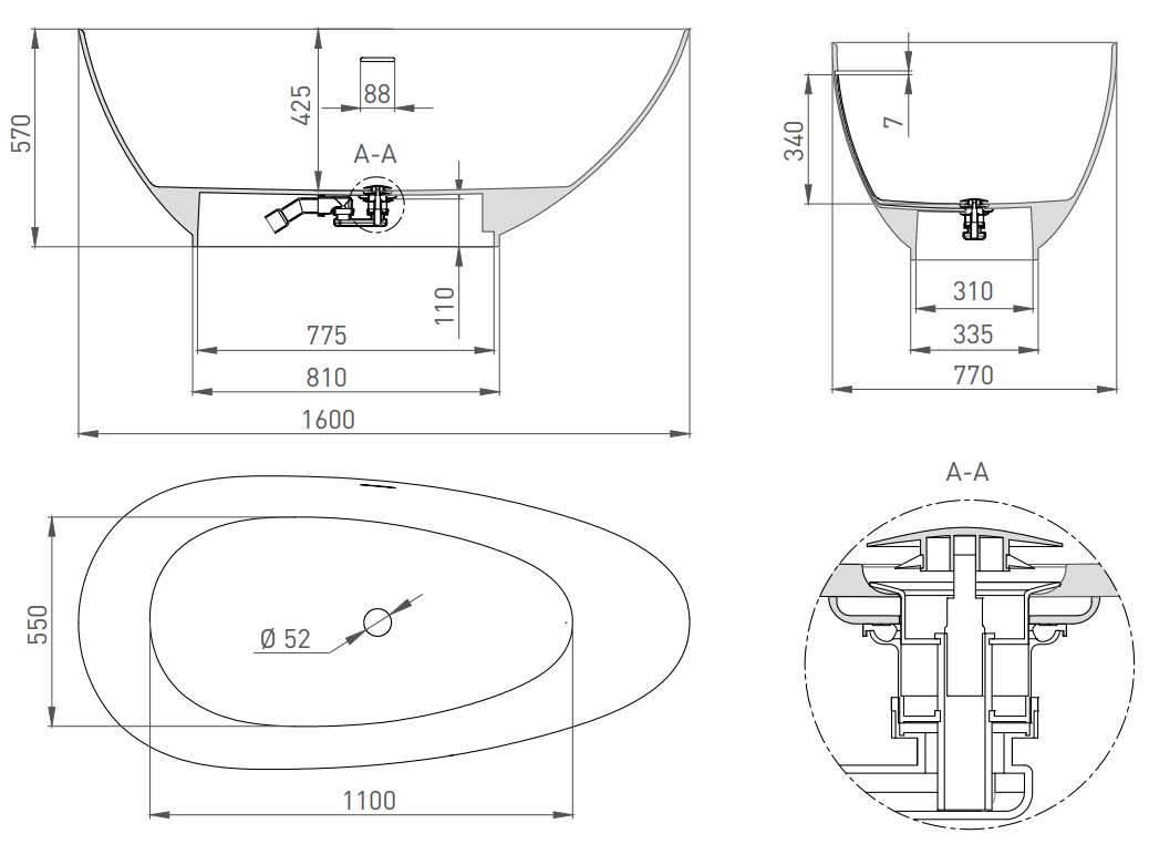 Базовая комплектация: ванна, слив-перелив интегрированный, донный клапан "Up&Down", сифон.