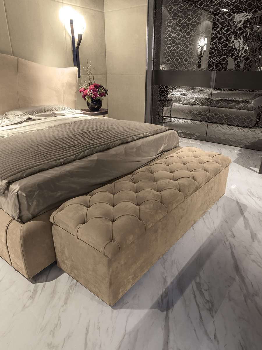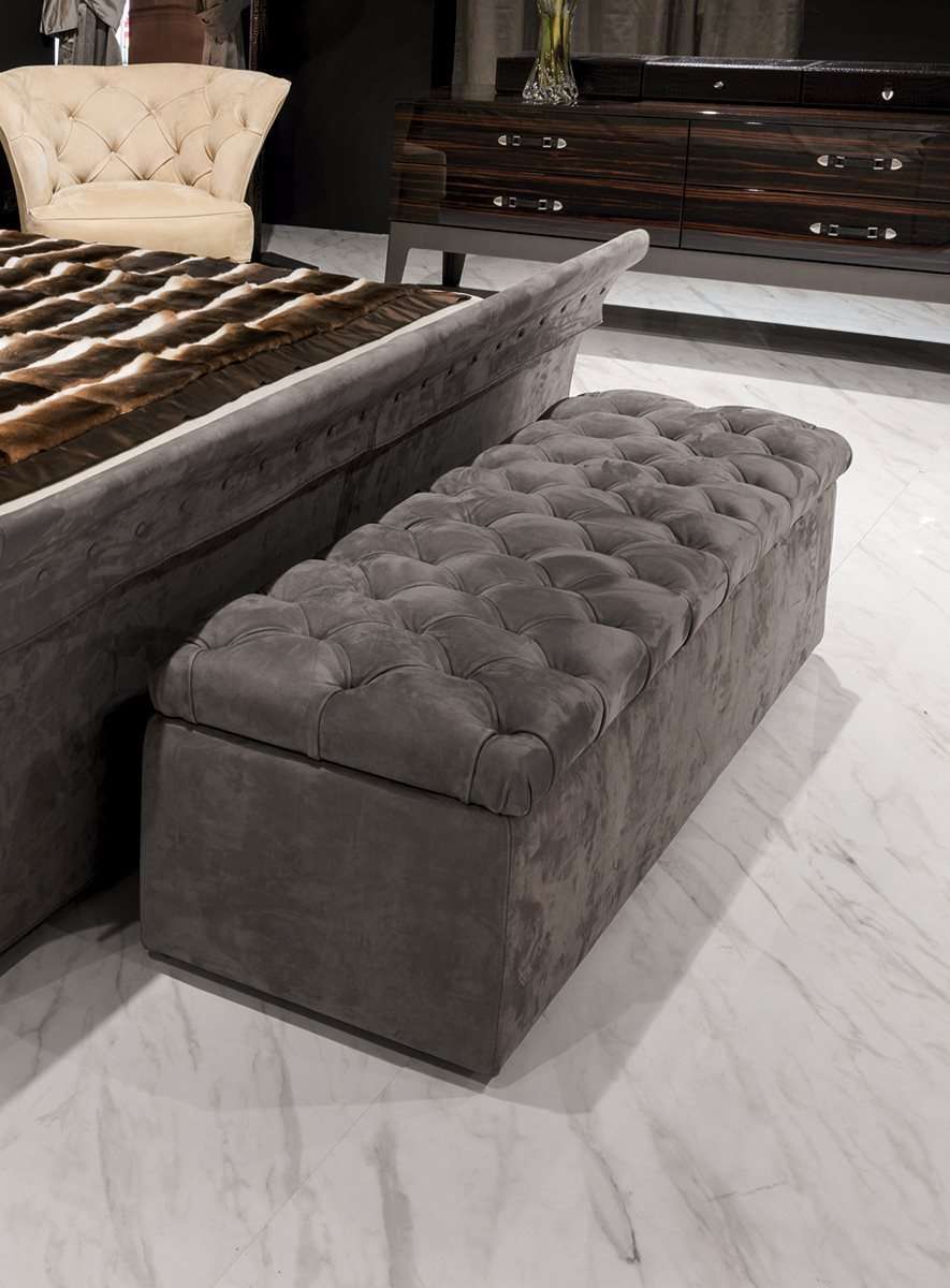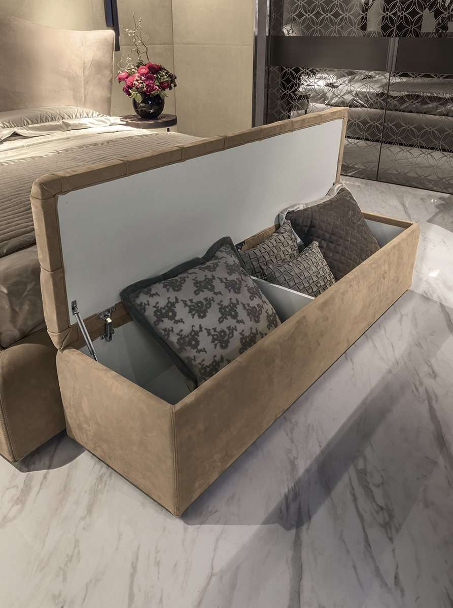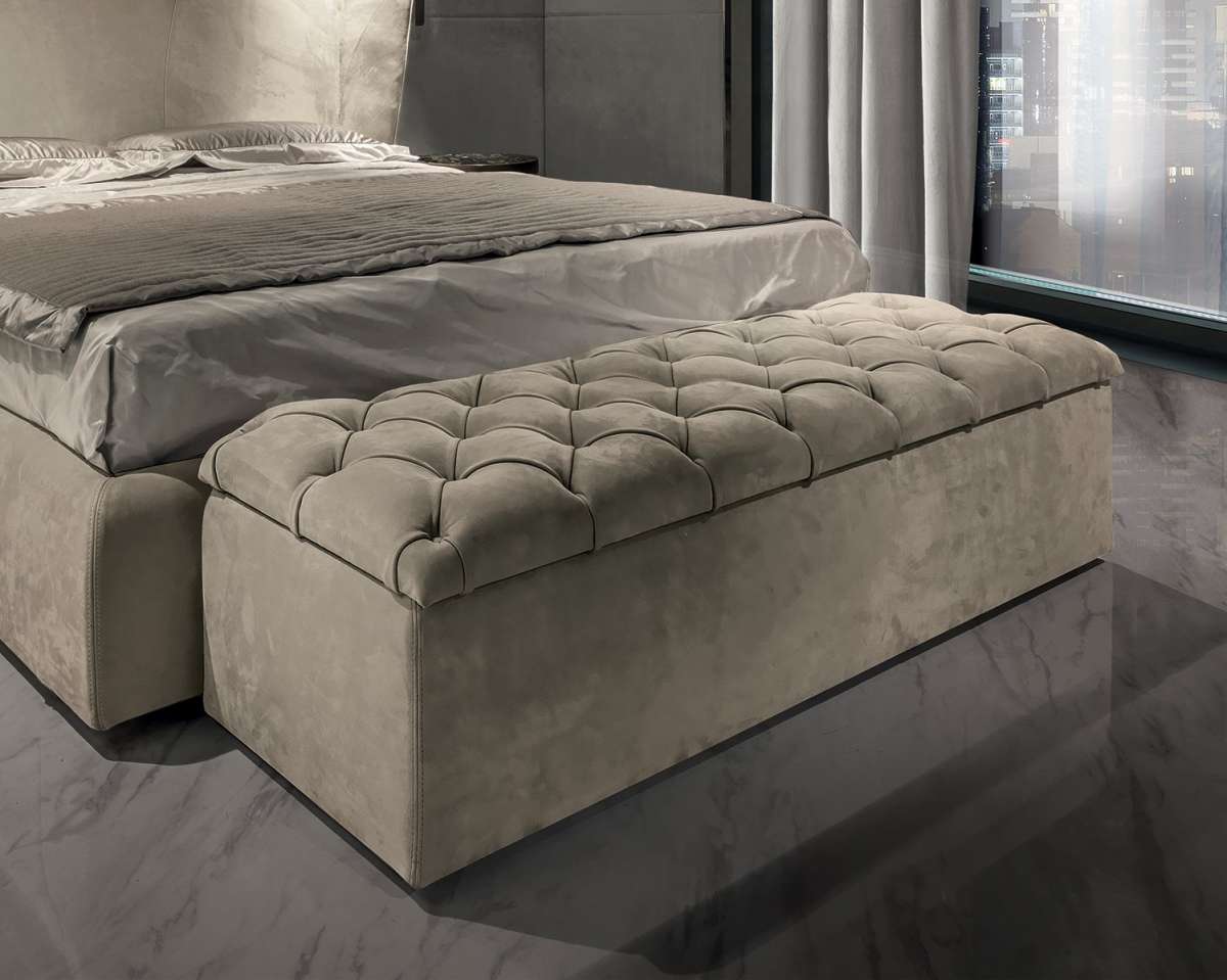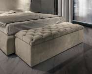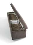 Скамья-контейнер SAM с крышкой декорирован отделкой капитоне со строчкой в виде четырехугольников.