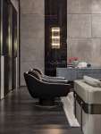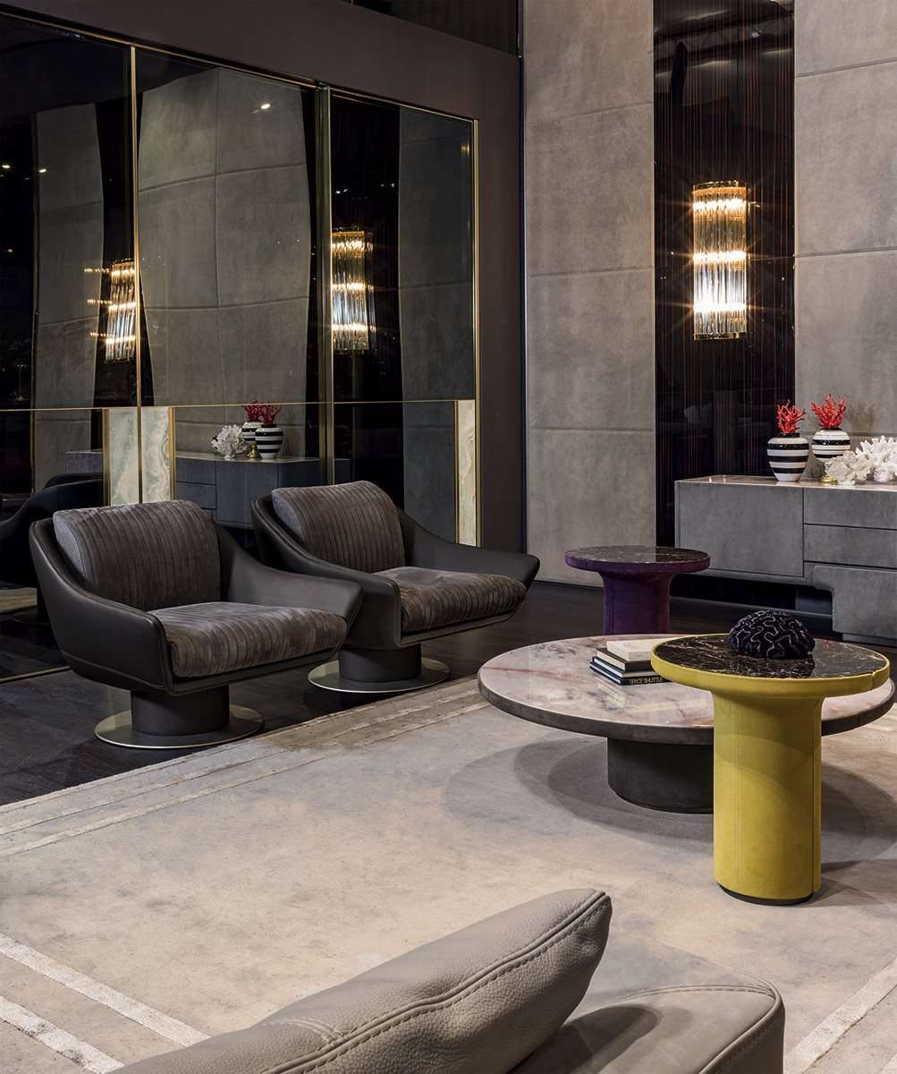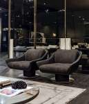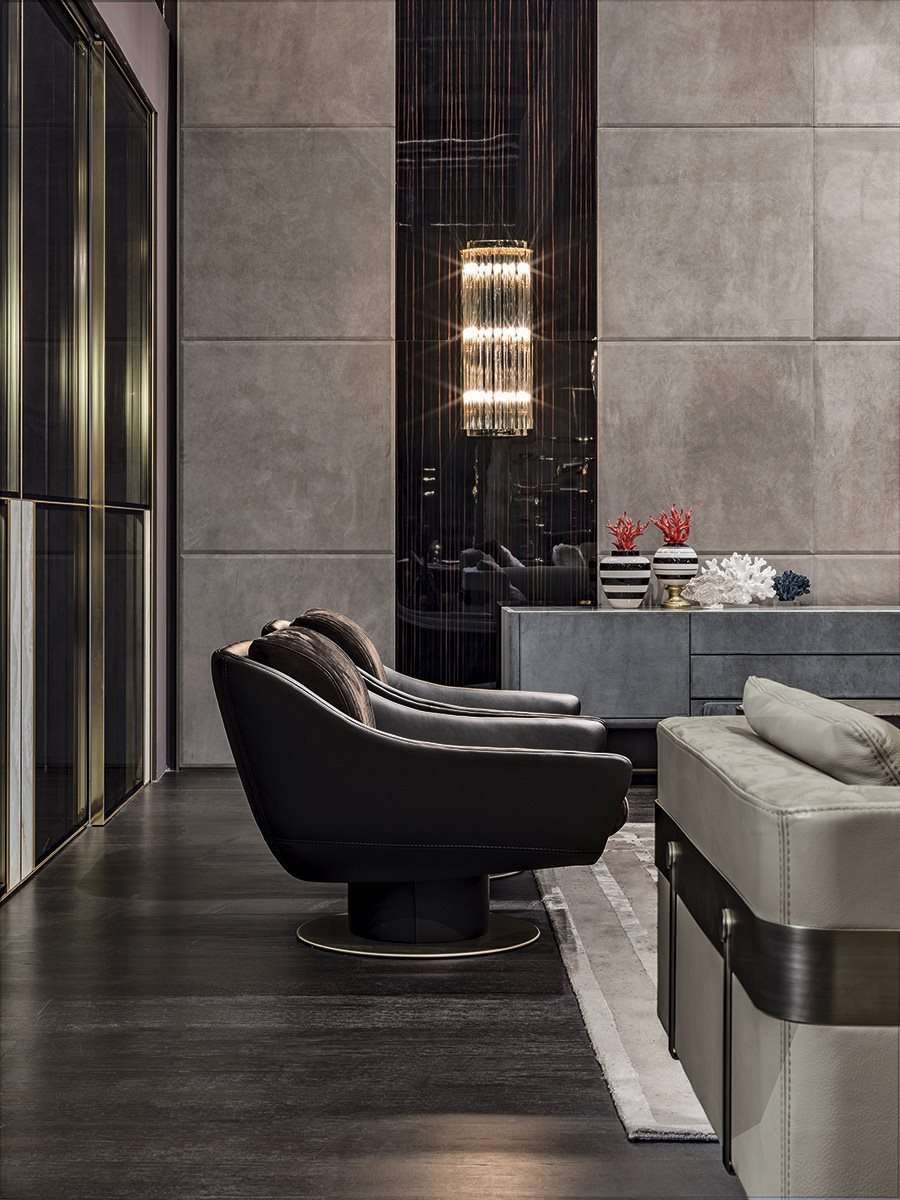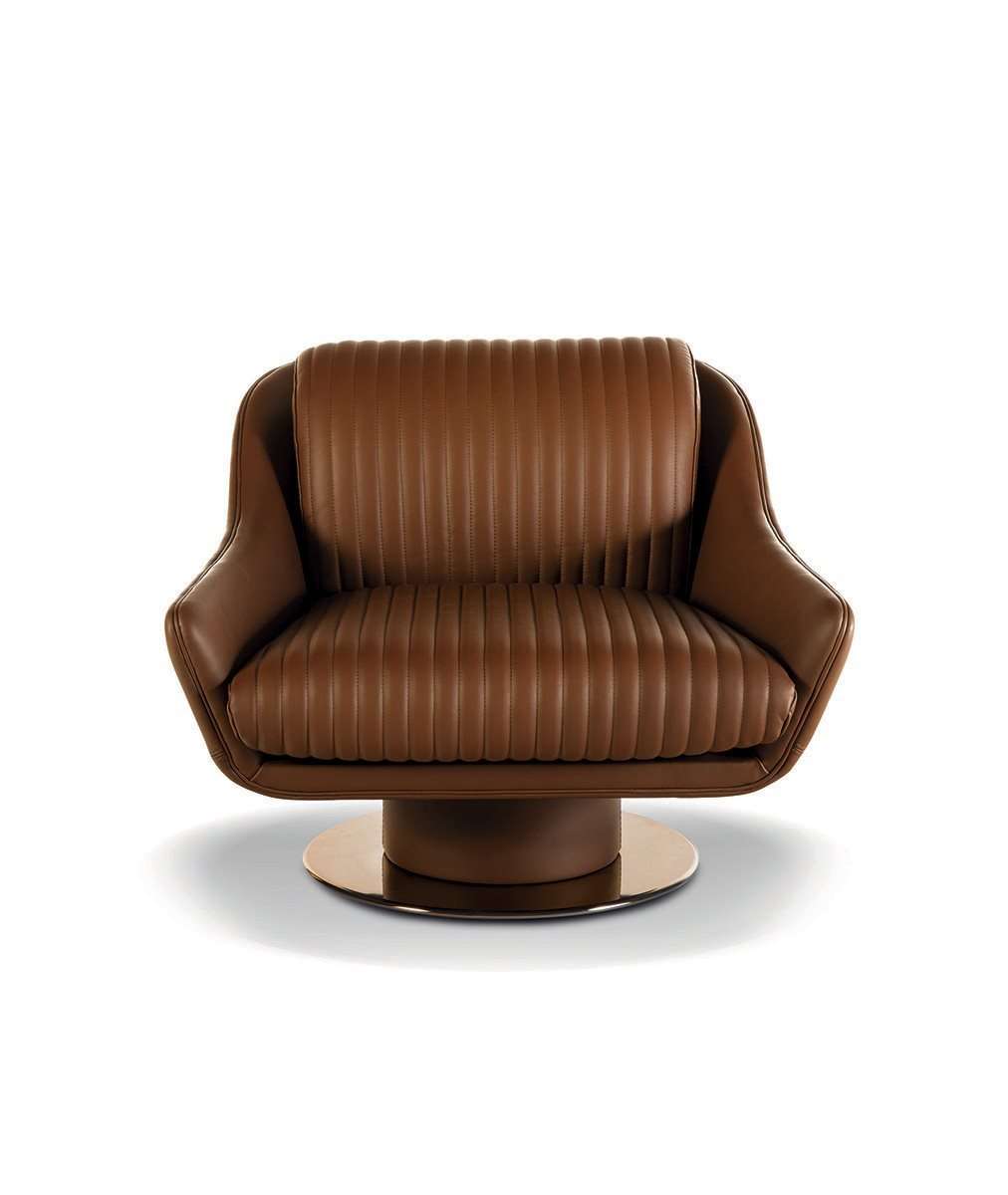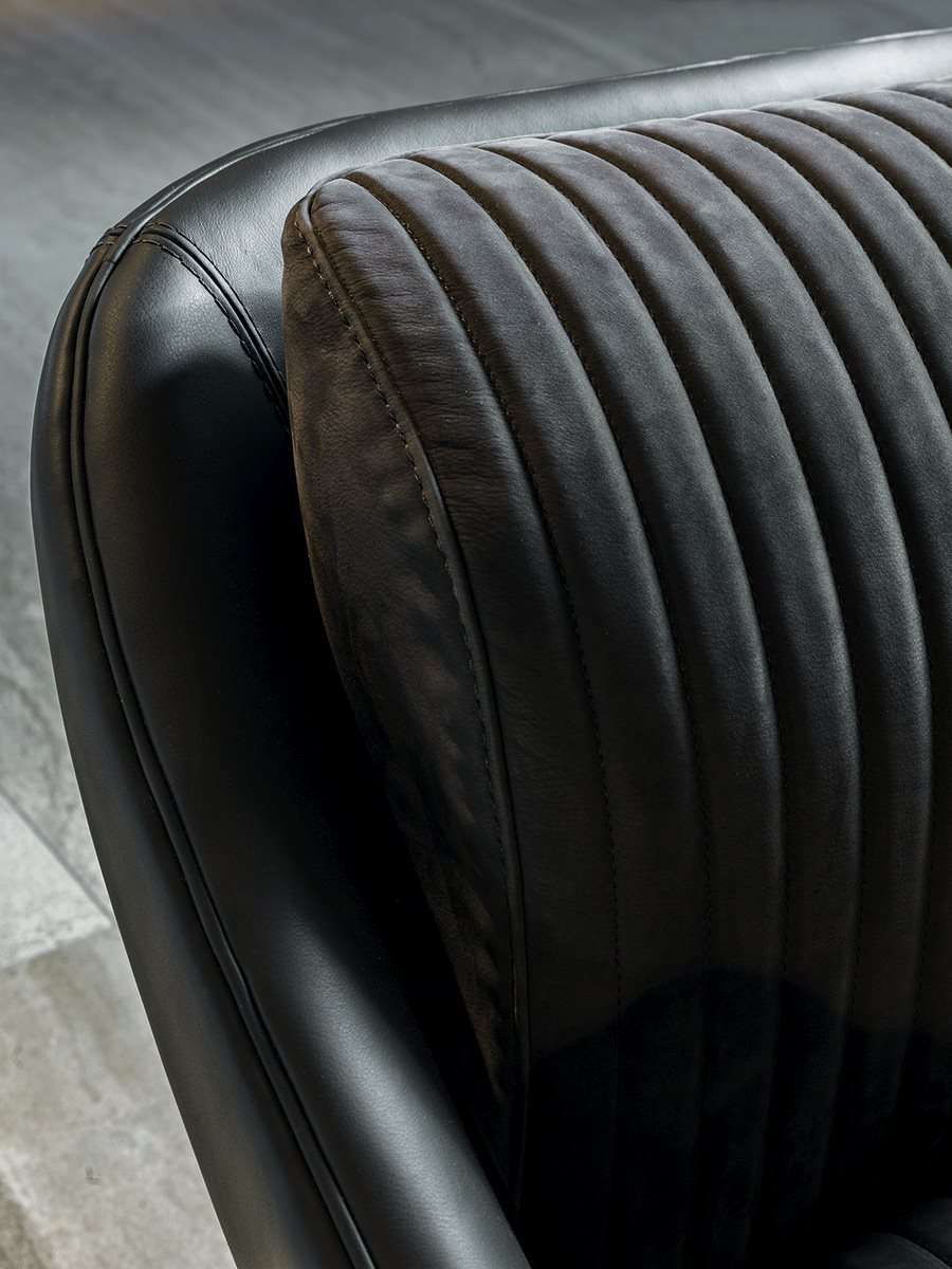 Дизайн основан на эстетической игре сочетаний материалов: гладкой кожи, которая используется на округлых поверхностях спинки, переходящей в подлокотник, и прошитого полосами сиденья. Этот изысканный эстетический язык находит выражение в мягких формах и эффектных деталях, как, например, основание из металла с обтянутым кожей цилиндром с самоустанавливающимся механизмом, поворачивающимся на 360°.