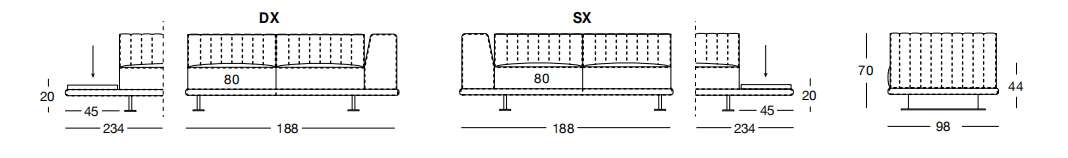 YOUNG 188х98 см LONGHI Боковая секция со столиком 45 см (SX/DX)